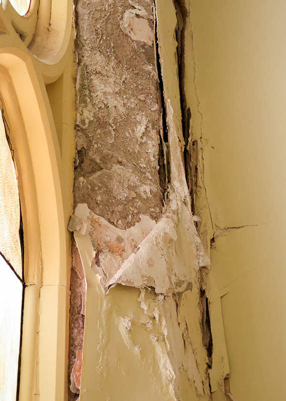 Up the flight of stairs opposite the entry to the parish house, you will find a large, stained-glass window. Before the recent roof repairs, water seeped around the masonry of this window, eating away at the mortar and plaster. This detritus has been shedding continually since, not only destabilizing the window but also making a mess of the space upstairs.